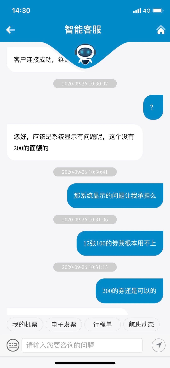 虽然总价相同,但小益觉得机票券面值改变了,对自己有较大的影响。“200元的券用6次更适合自己,而100元的用处不大。”因此,小益立马联系南航客服反馈问题,还把 200元6张的宣传页面截图发给了客服。客服回复称,没有200面额的机票券,应该是系统显示错误,并表示会记录反馈。但小益接受《消费者报道》采访时表示,还未等到处理结果。