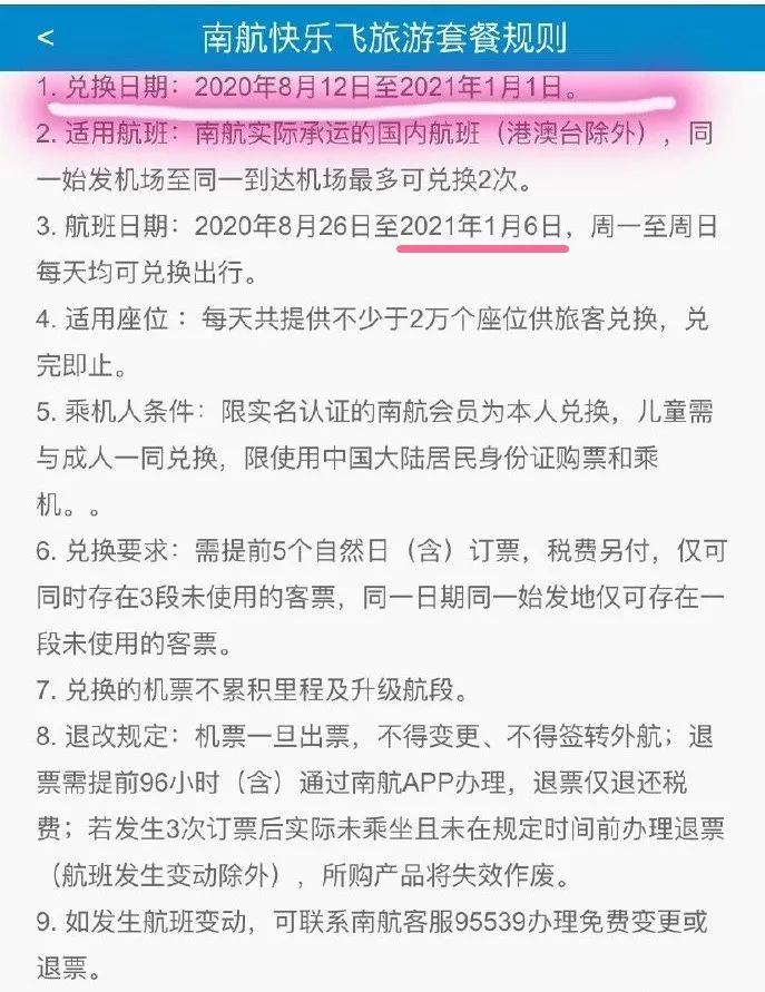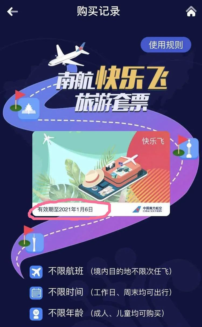但随后两天,蒋女士才通过“南航快乐飞旅游套餐规则”发现,这个宣称“2021年2月1日”到期的套餐,实际有效期居然提前了近一个月,兑换期只到2021年1月1日,可兑换的航班日期也只到2021年1月6日。