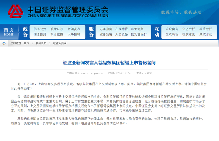 11月4日晚间,就蚂蚁集团暂缓上市一事,证监会新闻发言人对外表示,避免蚂蚁集团在监管政策环境发生重大变化的情况下仓促上市,是对投资者和市场负责任的做法。