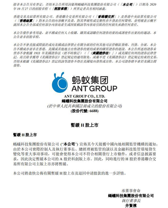 蚂蚁集团在港交所公告表示,3日接获中国内地相关监管机构的通知,由于公司实际控制人及执行董事长、总经理被监管约谈以及金融科技监管环境发生变化等重大事项,可能会使得公司不符合相关发行上市条件或者信息披露要求,因此决定暂缓公司的A股于科创板上市。因此,同时进行的H股于香港联合交易所有限公司主板上市亦将暂缓。公司将尽快公布有关暂缓H股上市及退回申请股款的进一步详情。