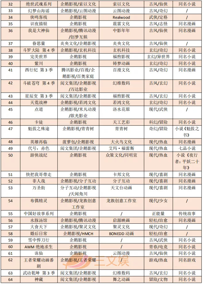 在三文娱《腾讯爱奇艺公布了100多部动画》一文中,我们盘点了腾讯视频接下来要上线的众多动画项目,其中腾讯视频(企鹅影视)与阅文集团联合出品的就有《全职法师》《斗破苍穹 第4季》《星辰变 第3季》《代号:赤色》《武动乾坤 第3季》《神藏》等,另外还有多部作品改编自同名小说。
