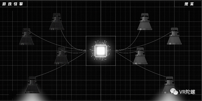 陀螺君了解到,在直播过程中,红外摄像机通过接受遍布整个舞台的反射点,透过标记点反射的红外线,即可计算出虚拟摄影机的即时位置,并使之与现实中的摄影机分工合作,保证在直播过程中摄像机机位切换不出差错。最后再透过Unreal Engine 的渲染运算,在直播中构建出整个游戏场景。整个XR直播技术下来,制作团队保证了现实与虚拟渲染的误差小于1毫米。