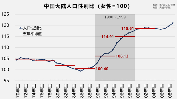 如果每五年一平均,那么1990年代前后,出生人口性别比出现了明显的三级跳。
