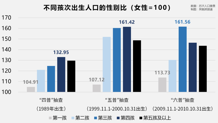 “四普”时,第一孩的出生性别比仅为104.9,处于自然水平;二孩三孩的出生性别比虽然不正常,但至少不离谱。而到了“五普”“六普”时,二孩三孩的性别比高达150乃至160,触目惊心。