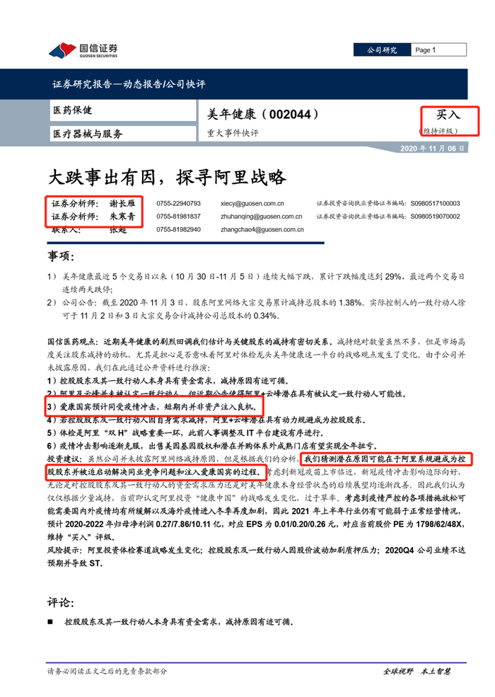 引发爱康国宾怒斥的这份名为《大跌事出有因,探寻阿里战略》的研究报告发布于11月6日,全文以美年健康最近5 个交易日以来(10 月 30 日-11 月 5 日)连续大幅下跌且累计下跌幅度达到 29%为由头,将近期美年健康的剧烈回调归结于与其关键股东的减持有密切关系。