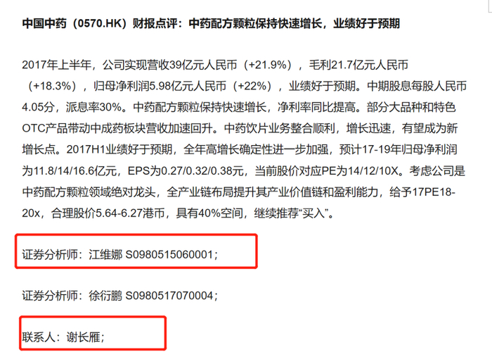 可以佐证的是,自2017年开始,江维娜与谢长雁二人共同署名发布了至少十余份医药行业或相关上市企业的研究报告,谢长雁也从最初报告署名中的联系人一步一步成长为与江维娜同列的联名作者,从早期的 乐普医疗 、中国中药、 迈克生物 ,到后期的 益丰药房 、 迪安诊断 、 康弘药业 等等研究报告中,皆可见江维娜与谢长雁合作的影子。