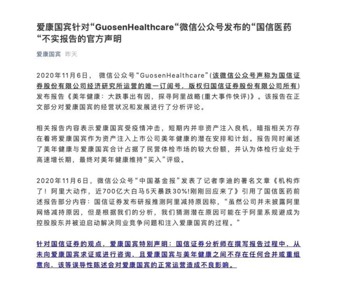 11月10日下午,与美年大健康同属国内体检行业巨头的爱康健康科技集团有限公司在官方微信公众号“爱康国宾”发布一则有关“国信医药”不实报告的官方声明,驳斥一份日前由国信证券发布的研报中所称的爱康国宾与美年健康合并的可能。