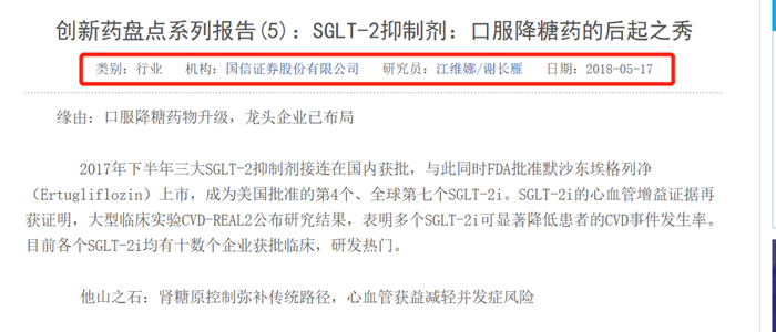 江维娜与谢长雁合作的最后一份报告为发布于2018年5月的《创新药盘点系列报告(5):SGLT-2抑制剂:口服降糖药的后起之秀》,在该报告中,江维娜署名为第一作者,第二作者即为谢长雁。