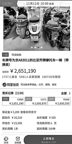 在昨日进行的一场司法拍卖中,一辆京A牌照的比亚乔牌摩托车,经过几个小时1100多次加价,从16310元喊价至265万元。