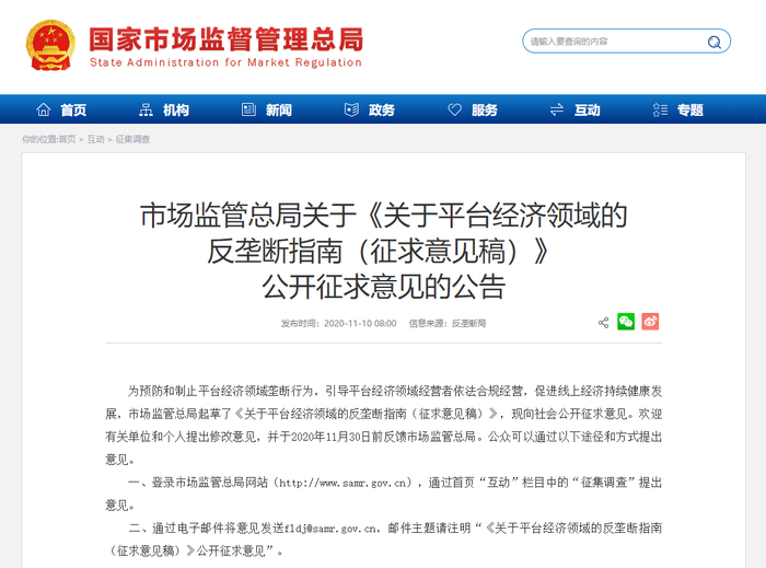 北京时间2020年11月10日,中国国家市场监督管理总局,正式向全国下发【关于平台经济领域的反垄断指南】意见稿,公开向全社会人民征求意见!!