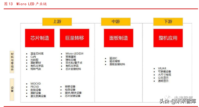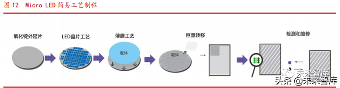 从工艺制成上看,Micro LED 前段制程与面板、IC 电路相似,同样需要外延片、 RGB 三色晶粒与组装,但巨量转移制程是一个特别环节,而目前 Micro LED 量产最 大难关就是在此环节上。
