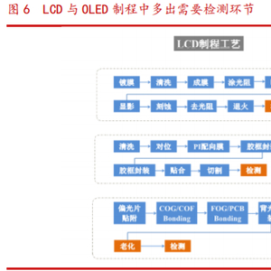 从设备角度:(1)设备是下游培养的:京东方对整套工艺的理解不断提升,寻找 国产设备替代已经开始;(2)模组段是最为合适的环节:模组与下游终端最近,具备 先天的合作基础(Array 和 Cell 的设备数量和工艺商早已敲定/绑定进口平台);(3) 检测是最佳的国产化载体:检测设备数量弹性很大,离线式可以脱离进口平台,绑定 性不强;