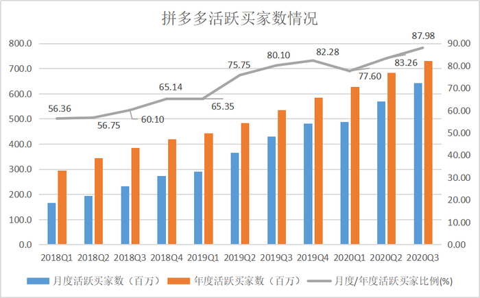 在用户数量方面,截至今年9月底,平台年活跃买家数达7.313亿,较上年同期净增1.95亿,较上一季度净增4810万;今年三季度,拼多多APP平均月活用户数达6.434亿,较上年同期的4.296亿增长50%,较上一季度净增7460万。