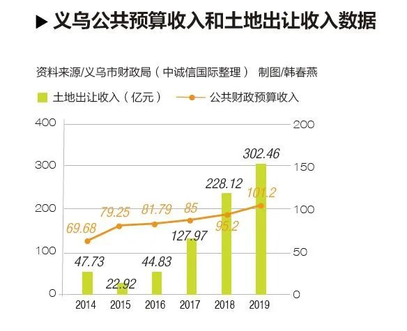 义乌的收入主要来自税收和政府性基金,其中税收额比较稳定,增幅有限,政府性基金则成为义乌政府创收的核心来源,土地收益更是增收重点中的重点。2015年到2017年,义乌出让土地的收益急速增加,从23亿元增加到128亿元。2019年,义乌土地出让收入已经超过300亿元。