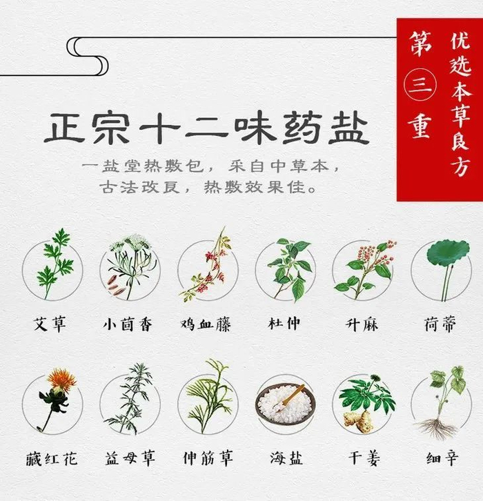 除此之外,里面还添加了十余种草本植物,采用古方配比,用量精准,让粗盐热敷的功效更加锦上添花。
