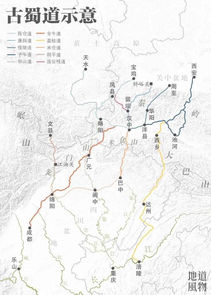 此后,这些打通秦、蜀二地之间的古道——由关中通往汉中的褒斜道、子午道、陈仓道、傥骆道;由汉中通往四川的金牛道、米仓道、荔枝道以及甘肃陇南到四川绵阳的阴平道等,成为了战时南北方争夺的焦点。光是三国时期,就有诸葛亮“六出祁山”、姜维镇守剑门、赵云兵发斜谷……每条几乎都硝烟四起。
