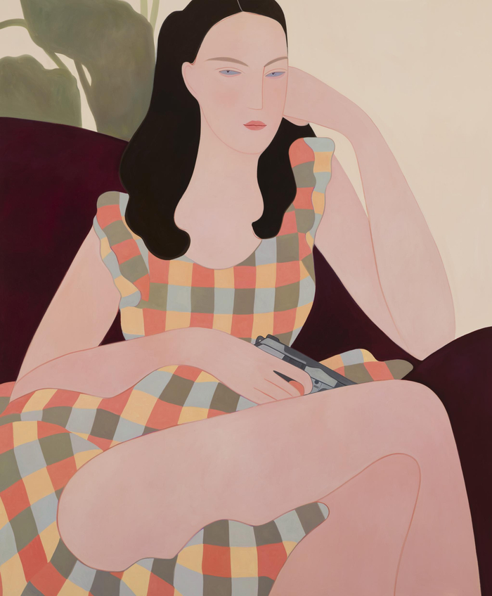 © Kelly Beeman, At Home with a Gun, Oil on canvas, 152.4 x 182.9 cm, 2020. 图片致谢艺术家与3125C Galleria