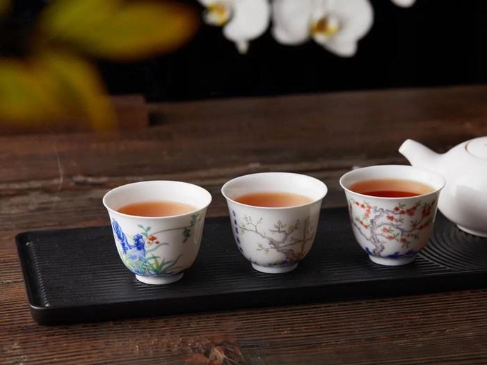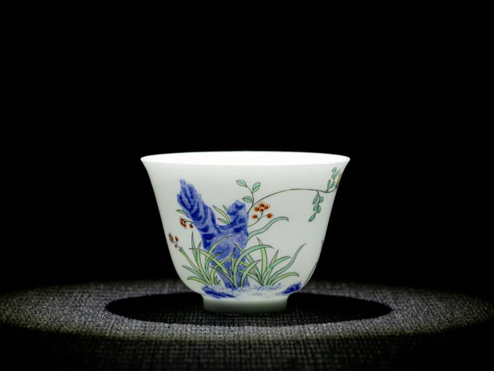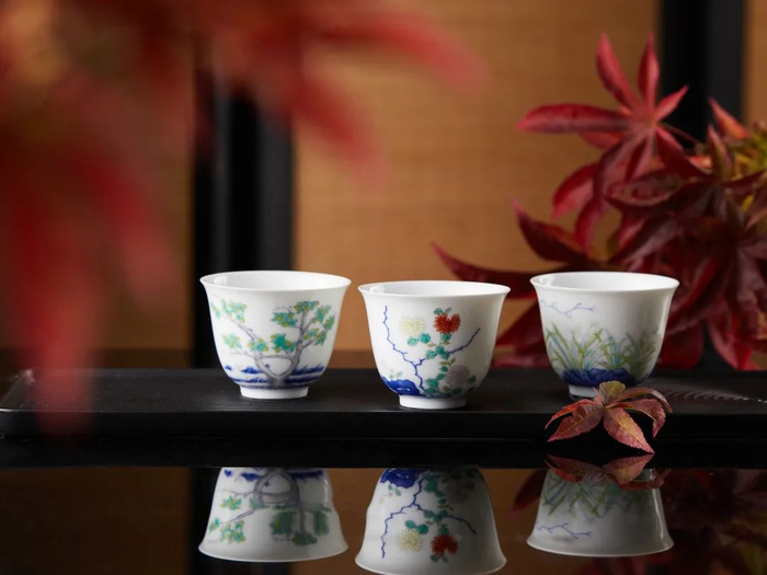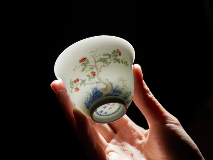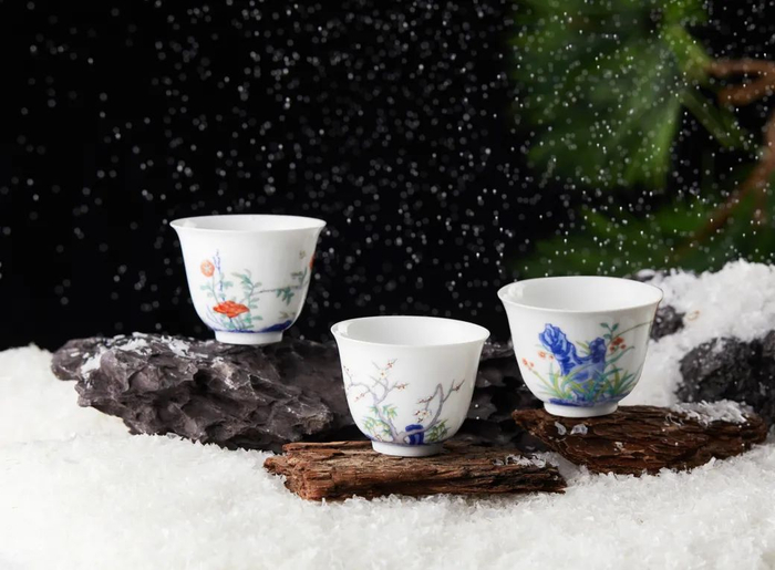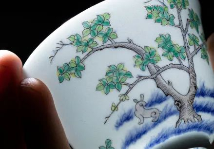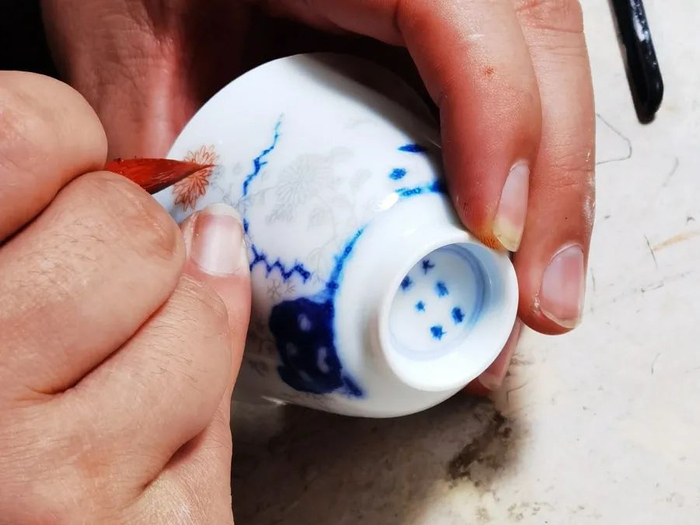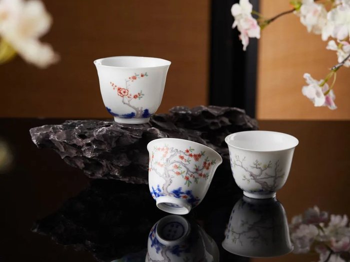 但为了还原古韵,复刻十二花神杯,非“三画四烧”不可:青花打底,一烧→黑线勾勒,二烧→矾红油彩渲染,三烧→五彩填彩,四烧。
