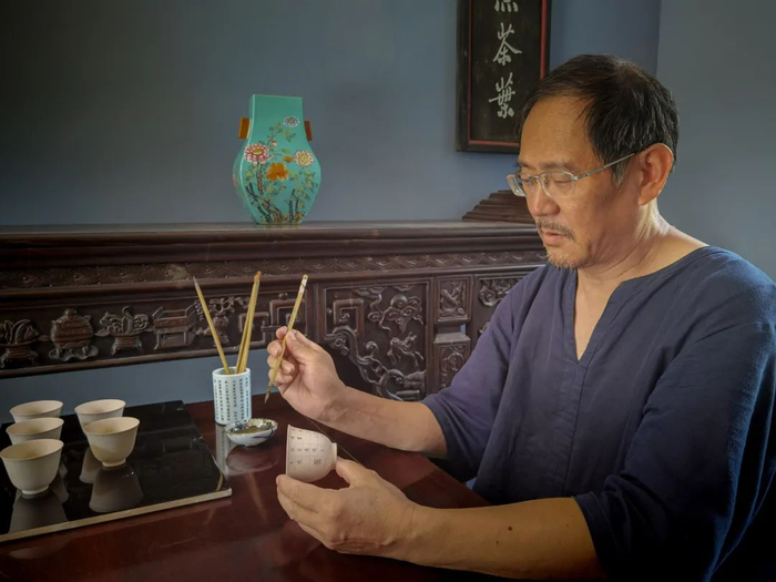 花神杯的釉只能细细地、慢慢地吹,不能采用浸釉,大量的釉水涌入会让原本就薄脆的坯体直接融于釉中,功亏一篑。