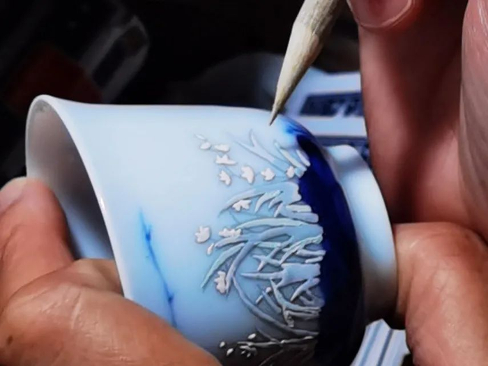 这才使得成品有着独特的温润质感,且瓷体纤薄通透、洁白如玉。