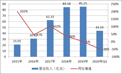 自2015年至2019年及2020Q3,公司营业收入分别为21.01亿元、30.82亿元、62.33亿元、84.58亿元、85.25亿元和44.19亿元,同比增速分别为202%、47%、102%、36%、1%和-30%。,从成长性看,2015年至2018年,公司营收增速超过30%,可谓高速增长,但2019年后其业绩增长乏力,同时出现巨额亏损,2020年在新冠冲击下业绩大幅缩水。