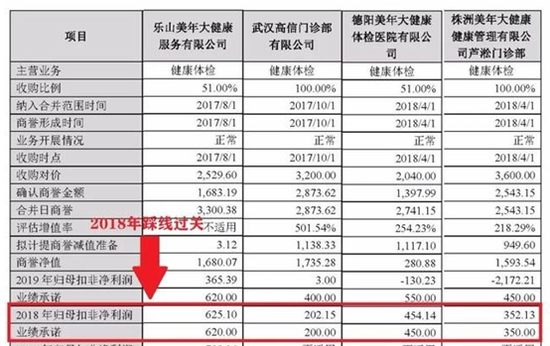 同时,除了这5家子公司之外,39家里面2018年美年健康还存在几家踩线过关的子公司。慈铭体检2017、2018两年踩线,实际利润高出承诺业绩不超过8%;武汉高信,以及株洲、乐山、德阳三地的美年大健康公司,仅仅比承诺的净利润高了不到1%。