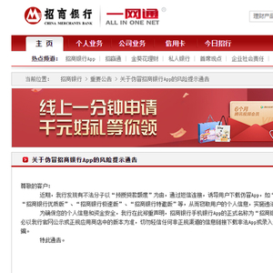 为确保您的个人信息和资金安全,招商银行郑重声明,招商银行手机银行App的正式名称为“招商银行”,App的下载请务必以官网公示或正规应用商店中的版本为准,切勿轻信任何非正规渠道的信息链接下载非法App或录入个人信息,谨防上当受骗。