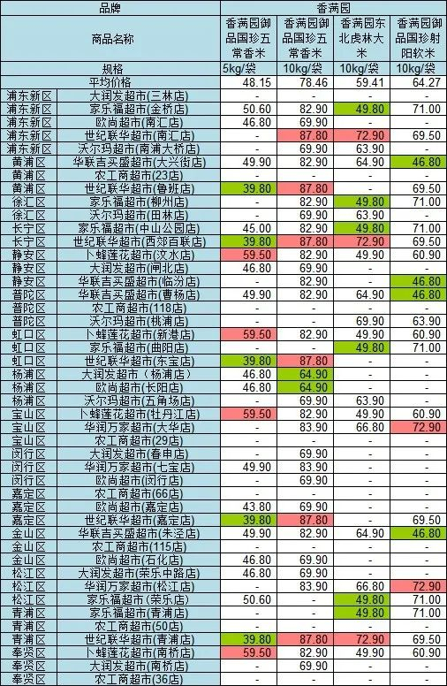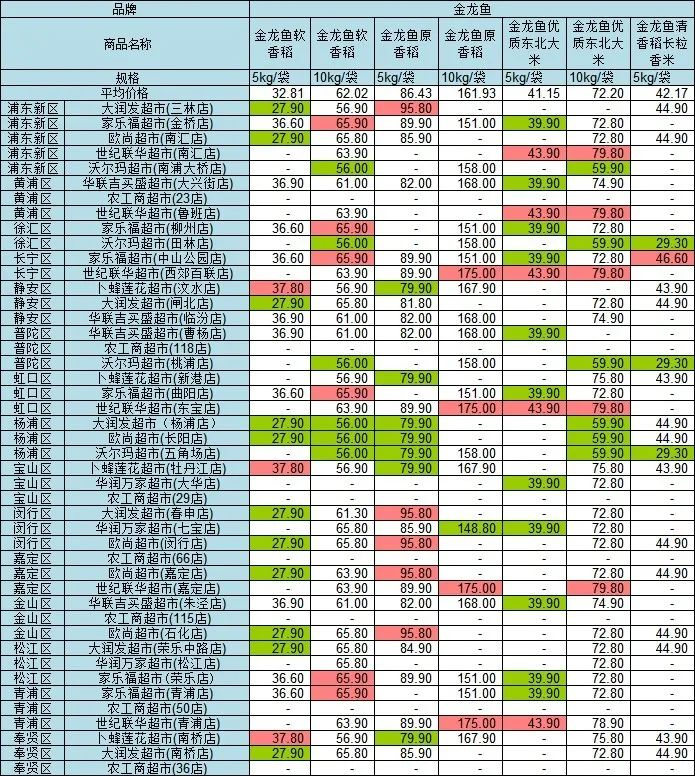 2、粉底标注代表该商品在全市45个超市监测点的最高价;绿底标注代表该商品在全市45个超市监测点的最低价。
