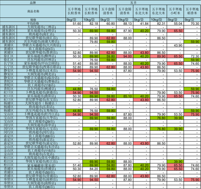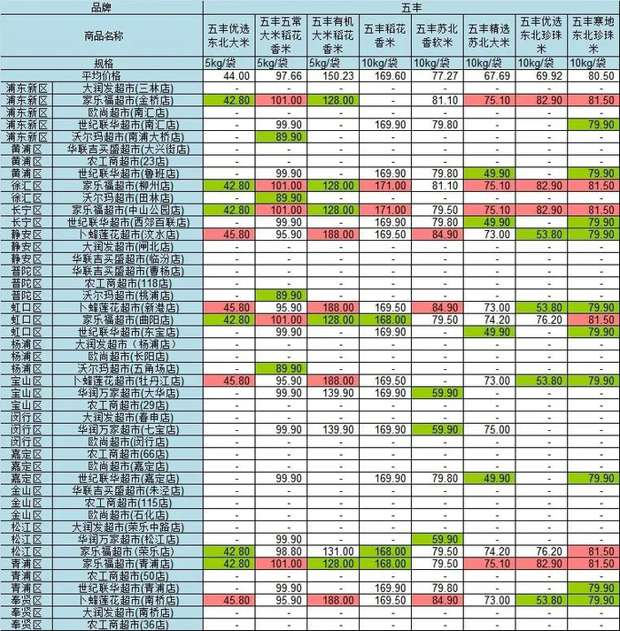 五丰有机大米稻花香米(5kg/袋),在卜蜂莲花超市汶水店、新港店等售价为188元,在家乐福超市柳州店、中山公园店等售价为128元,差价最大,为60元。