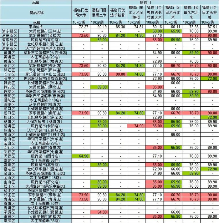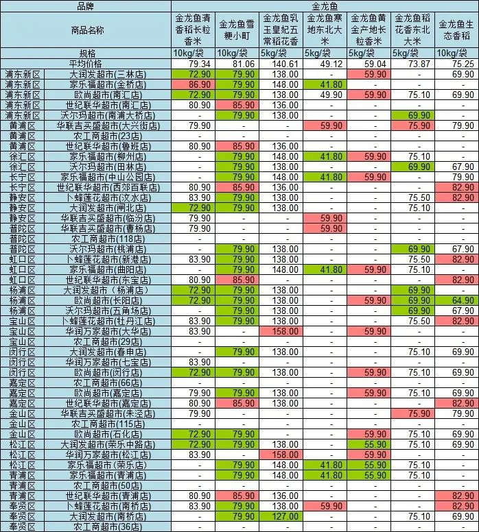 金龙鱼优选苏北大米(10kg/袋),在家乐福超市荣乐店、青浦店等售价为75.8元,在沃尔玛超市桃浦店、五角场店等售价为44.1元,差价为31.7元。