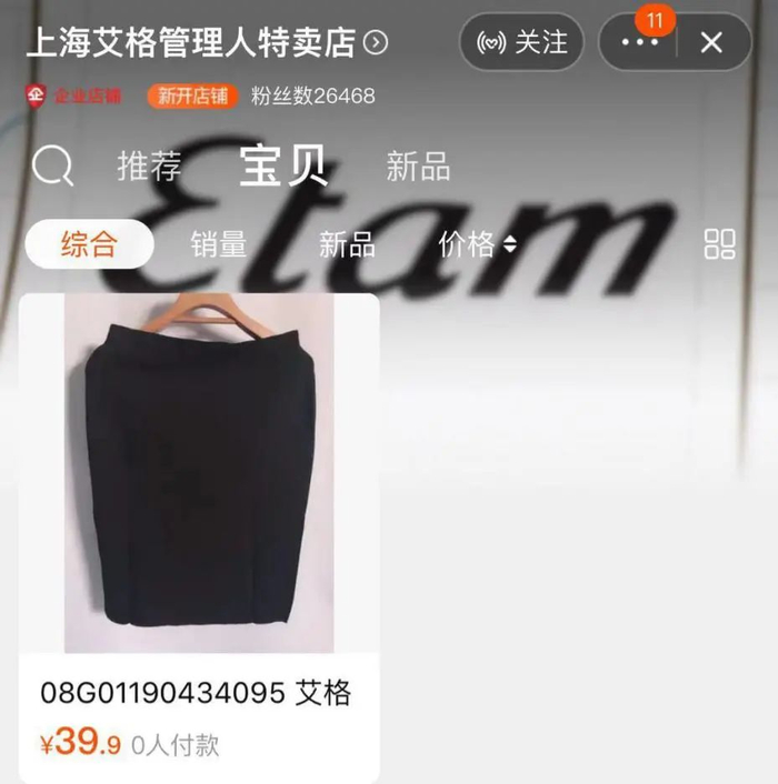 这批服装上架的店铺名称是“上海艾格管理人特卖店”。目前相关网店中仅剩一款商品,售价仅为39.9元,销量超过200件。