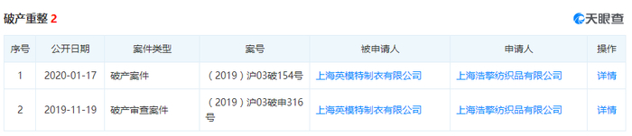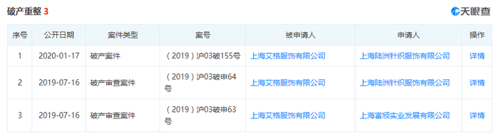 天眼查显示,上海艾格服饰有限公司已于去年被上海陆洲针织服饰有限公司申请破产重整,经办法院为上海市第三中级人民法院,案号(2019)沪03破155号。