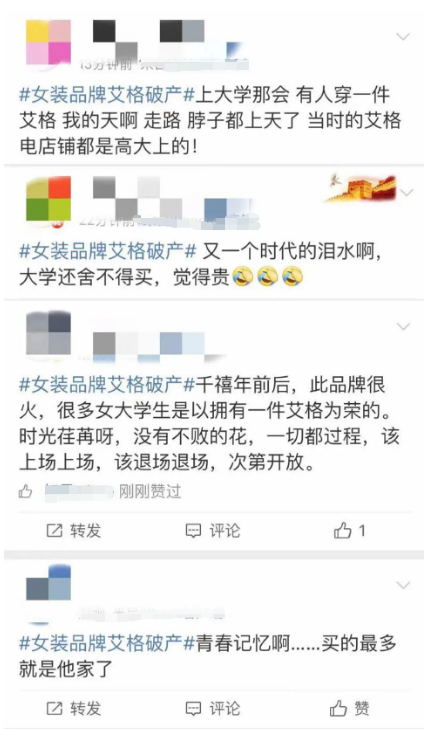 对于不少“80后”“90后”来说,尽管随着时代变迁,各种“潮牌”层出不穷,但艾格依旧是青春时代里印象深刻的“白月光”。因此,时隔许久后在热搜上突然看到“女装品牌艾格破产”的消息,无疑是晴天霹雳。