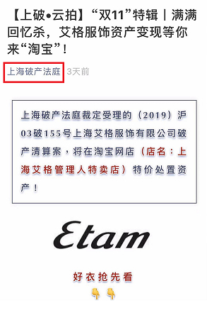 今年“双11”,上海破产法庭公众号发布的一则“双11特辑”消息,更是以“全场一折”的跳楼价处理艾格的剩余资产。