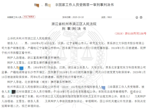 2020年10月10日,中国裁判文书网公示了《杨某、易某明非国家工作人员受贿罪一审刑事判决书》((2019)浙0108刑初186号),裁定书详细披露了本案的相关细节。