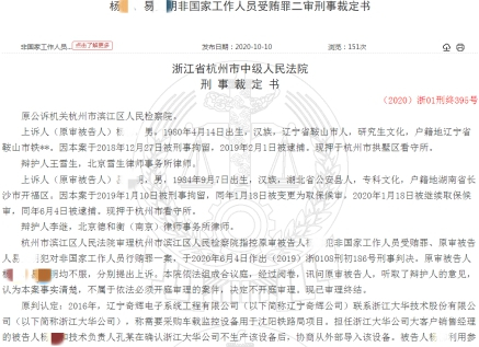 裁定书显示,经审理查明,2016年,辽宁奇辉电子系统工程有限公司联系浙江大华公司,称需要采购车载监控设备用于沈阳铁路局项目。担任浙江大华公司大客户销售经理的被告人杨某和技术负责人孔某在确认浙江大华公司不生产该设备后,协商从外部导入该设备。被告人杨某利用参与该项目及推荐供应商的职务便利,帮助被告人易某明成为浙江大华公司该项目的独家供应商,并在产品设计、文件准备、付款等多方面对被告人易某明予以帮助。被告人易某明从深圳羿龙电子有限公司采购设备,以北京富视公司名义实施该项目并获利385万余元,并多次向被告人杨某贿送钱款共计130万元。2017年,沈阳铁路局动车组发生车载监控设备失火事故,系被告人易某明提供的监控设备。