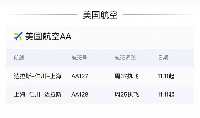 11月11日起,美国航空执飞达拉斯-沃斯堡至上海浦东航线,每周三和周日各运营一班,成为继美联航和达美航空之后,第三家复航中国的美国航空公司。