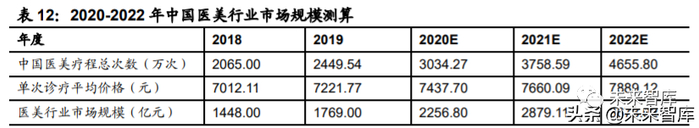 我们根据单次医美诊疗疗程价格与中国预估诊疗次数估算未来 3 年中国医美市 场规模,经测算,2018 年单次疗程价格约为 7012 元。基于 2016-2019 年中国 医美总疗程消费次数年复合增长率 23.87%,单次诊疗费用增速以过去五年医疗 保健及服务行业平均 CPI 增速 2.99%为基准,预计 2022 年中国医美行业规模将 超过 3600 亿元。