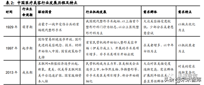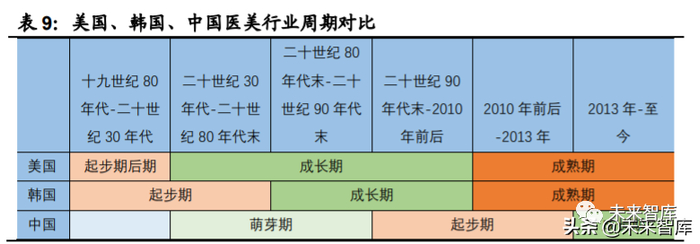 对比美国与韩国,中国医美市场起步较晚,目前仍处于成长初期阶段。21 世纪 初期,伴随着美容理念的逐步觉醒、肉毒素及玻尿酸等美韩先进医美技术和微整 形项目开始传入中国,国内医美行业得以起步发展。2013 年开始步入成长期, 距今也仅 7 年左右的时间,国内医美正在逐步成长为朝阳行业。