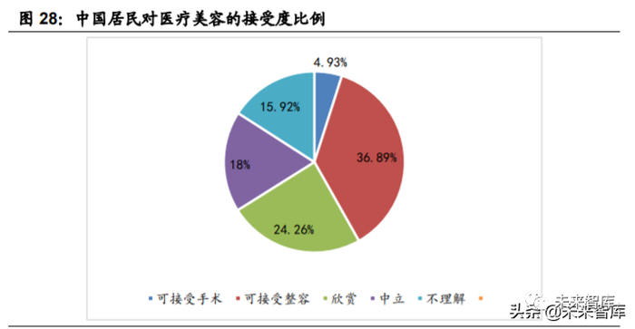 从人口渗透率看,医美在中国的人口渗透率低于2%,数据上看仍属于小众消费, 存在大量潜在消费者。根据新氧大数据,2018 年,中国对医美持正面态度的人 群占比达 66%,其中 37%可接受微整,24%持欣赏态度,近 5%的人接受手术 类项目调整,医美消费的认知接受度正在逐步提升。随着非手术类轻医美技术和 互联网医美平台的逐步成熟,安全便捷、价格透明等因素也将有效提高消费者的 医美信心,医美服务有望逐步渗透大众生活和基础消费。