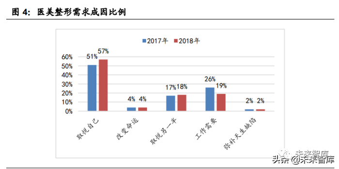 从求美动因看,需求者对医美的追求主要是自我欣赏与认可。根据新氧大数据, 2018 年医美需求产生的内部成因包括追求完美外形、希望通过外形改善提升自 信等自我审美认可占比达到 61%,较 2017 年提高 6 个百分点。