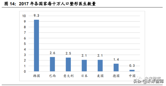 从供给端看,我国每十万人口拥有的医美机构及整形外科医生数量与成熟国家相 差甚远。根据清科研究数据,韩国整形医院共 2500 多所,各类医疗美容机构 10000 多家,测算每十万人口至少拥有 23.9 家医美机构。而中国每十万人口拥 有医美机构数量(包括非正规机构)仅为 6.6 家,拥有国内正规医美机构仅 0.9 家,机构资源供给紧张。从 2017 年的数据看,中国每十万人口仅拥有 0.3 名整 形外科医生,而美国拥有 2.1 名医生,韩国则拥有高达 9.3 名医生。