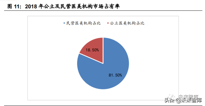 民营整形医院由于其盈利性质,对品牌力、获客力、服务力的要求均高于非盈利 公立医院,市场化定价模式也催生较高的价格水平,进一步提升“三力”水平。因此,民营整形医院在市场中发展迅猛,品牌知名度和认可度迅速培育并提升, 发展速度明显快于公立医疗机构,中国医美市场已形成以民营机构为主导的行业 格局,其中大型连锁机构以服务质量佳、医疗技术水平高、营销力度大而被消费 者熟知,成为发展速度最快的机构类型。