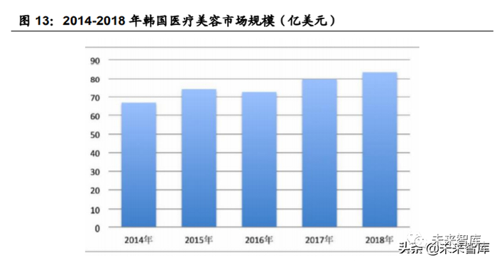 在韩国,医疗美容产业是国家经济发展的重要支柱之一,2018 年韩国医美行业 市场规模达到 83.6 亿美元(约合人民币 567 亿元)。韩国医美行业萌芽于朝鲜 战争期间,起步较美国晚,20 世纪 80 年代随着“亚洲四小龙”的经济与居民消 费力快速提升,韩国医美行业迎来快速发展。在“输出型”经济战略定位下, 2000 年前后韩国政府出台一系列政策和资金投入支持医美行业进一步繁荣。2009 年,韩国医疗观光合法化,2015 年,韩国政府再次重金支持医美行业发展, 计划到 2020 吸引 100 万外国医疗游客来韩国进行医美消费,医美经济输出战略 愈发明显。政策全面支持和政府大力推广,是韩国成为全球医美渗透率最高国家 的核心驱动力。