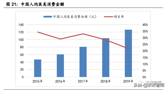 通过中国医美市场规模总额除以中国人口总额估算,2014-2019 年,中国全国人 均医美开支从 35 元增至 126 元,复合年增长率高达 29%,其中 2018 年正规医 美市场、全部医美市场全国人均消费额分别为 41 元、104 元,与美国正规医美 市场全国人均消费 166 元、韩国医美全国人均消费 1110 元相比,具备至少 4 倍 正规市场、10 倍整体市场消费提升发展空间。