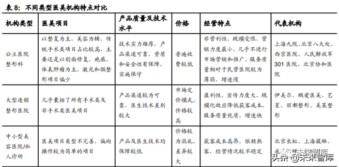医疗美容机构按照医院性质分为公立医院和民营医院,其中公立医院包括公立医 院的整形美容科和整形专科医院,民营机构包括大型连锁整容医院、中小型医美 机构及私人诊所。对于技术实力雄厚的公立医院而言,目前的整形美容科主要是 以整复为主、美容为辅,服务对象大多数为因先天因素或疾病、外伤、烧烫伤等 外在因素导致身体有明显缺陷或功能障碍的“病人”,不在医保报销范围内的消 费型医美项目仅顺带经营,可选项目较少且基本没有营销推广,品牌效应与服务 质量相对民营医院基础较为薄弱,市场份额占比较低。