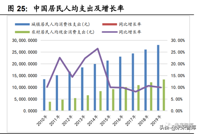 医疗美容属于可选消费,可支配收入增长是医疗美容市场增长的基础驱动力。中 国经济处于较为平稳上升的阶段,2014-2019 年,中国城镇及农村居民人均可 支配收入年复合增长率均高达 9%,人均消费支出年复合增长率分别达到 8.5%、 14.76%。消费升级不断,为国民医美消费能力提供坚实保障。