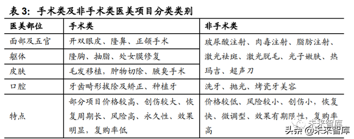 医美项目类型包括手术类和非手术类,手术类常见项目包括眼睑整形术、隆鼻、牙齿拔除矫正等;非手术类主要是通过注射、激光及其他基于能量的皮肤治疗, 常见项目包括玻尿酸注射、光子嫩肤及激光脱毛等。手术类整形项目一般具有价 格较高、创伤较大、恢复周期长、风险较高、效果明显且具永久性等特点,适合 需要进行大幅调整的消费者。非手术类项目具备单次价格较低、风险相对较小、 创伤小、恢复期短及可多次进行医美调整需求的特征,但不具备永久性疗效,例 如玻尿酸、肉毒杆菌素注射等维持时间有限,消费者在间隔一段时间之后需再次 消费以维持效果。因此,非手术类医美项目具备较高复购率,适合医美风险承受 力较低、追求方便快捷、调整幅度小或需求变化频繁的消费者。