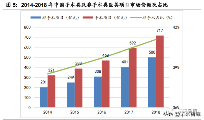 近年来非手术类项目越来越受到消费者青睐,非手术类医美项目市场份额超过手 术类,且规模占比逐渐提升。2018 年,非手术类医美项目市场规模达到 500 亿 元,占比 41.08%,且存在进一步提升趋势,非手术类医美项目及其美容材料需 求有望持续增长。