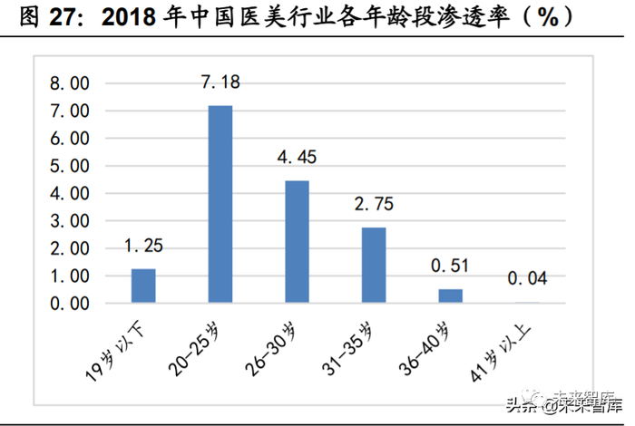 年轻群体以及医美渗透率的提高是医美市场的关键驱动力。随着消费升级进入 4.0 时代,医美消费波及的年龄范围不断扩大,新生代年轻消费者的医美消费需 求不断增长。在新氧医美平台,2019 年 25 岁以下消费群体占比 54.10%,95 后以及 00 后新生代医美消费者受益于随着互联网医美平台新渠道的崛起而涌现, 与 80 后消费者共同构成了互联网医美消费的主力军。2018 年中国医美渗透率 居首位的是 20-25 岁年龄层的消费者,其医美渗透率为 7.18%,其次 26-30 岁 年龄层的市场渗透率为 4.45%,经测算年轻群体消费者约占人口总数的 1%。